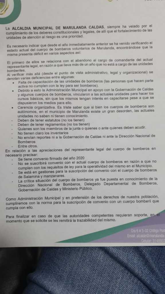 Al indagar por la situación actual del Cuerpo de Bomberos de Marulanda se oye de todo. El rifirrafe es entre Jorge Iván Henao Sánchez, actual comandante; y el alcalde, Juan David Grajales Marulanda.