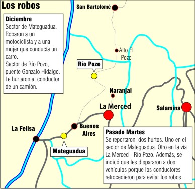 En la tarde, cerca del río Pozo, le quitaron las pertenencias a una persona que labora en una empresa que instala torres de energía en los potreros de esa zona. También los atacaron con arma de fuego.