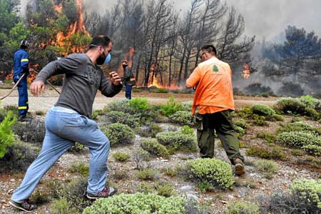 A pesar de los esfuerzos colectivos, las altas temperaturas, los fuertes vientos y la simultaneidad de los focos en distintos tipos de terreno provocan la mayor catástrofe de este tipo que se recuerde en Grecia.