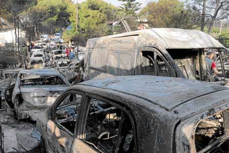 Arboles calcinados, carros carbonizados y casas devoradas por el fuego es lo que queda de una zona de veraneo y residencial a 30 kilómetros de Atenas, donde el fuego se cobra por el momento 74 vidas y causa 182 heridos.