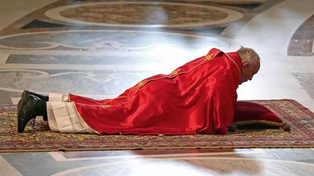 Bergoglio, como ya hiciera el pasado año en su primer Viernes Santo como pontífice, volvió a postrarse en el suelo vestido con los paramentos rojos para orar con el rostro sobre un cojín de terciopelo ante el Altar de la Confesión, bajo el que descansan, según la Iglesia, los restos del Apóstol Pedro.