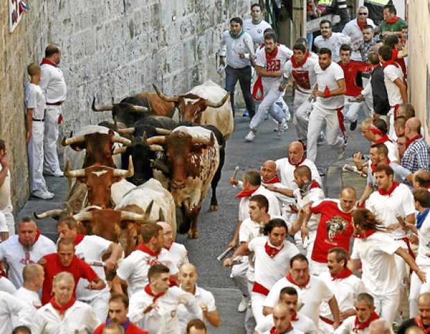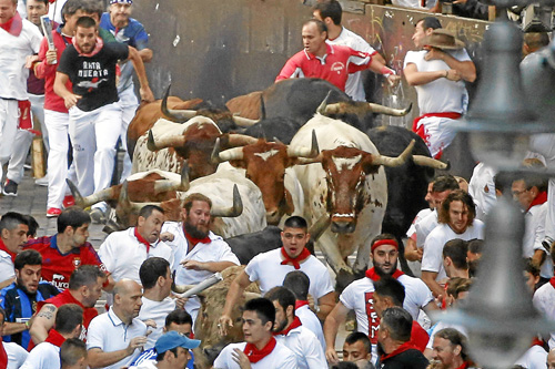 Los toros de Fuente Ymbro, que se fueron estirando durante todo el recorrido hasta romperse en la céntrica calle Estafeta, crearon emoción en este primer encierro de las fiestas más icónicas de España que se prolongarán durante nueve días.