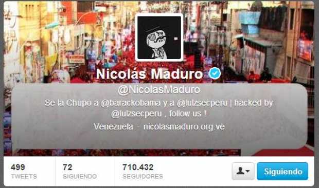La cuenta de Twitter del presidente encargado venezolano y candidato oficialista a la Presidencia, Nicolás Maduro, fue pirateada hoy minutos antes del cierre de las mesas de votación en Venezuela, denunció el Gobierno y el equipo de campaña del chavismo.