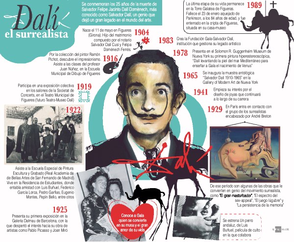 Se conmemoran los 25 años de la muerte de Salvador Felipe Jacinto Dalí Domenech, más conocido como Salvador Dalí, un genio que dejó un gran legado en el mundo del arte. Contiene biografía del artista.