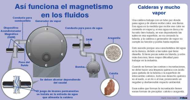 La incrustación es mayoritariamente carbonato de calcio, que precipita de forma dura, es decir, calcita. Sin embargo, con el campo magnético lo hace en forma de aragonita, como arena, que si bien no se va con la propia agua, se puede quitar con agua a presión, sin compuestos químicos.