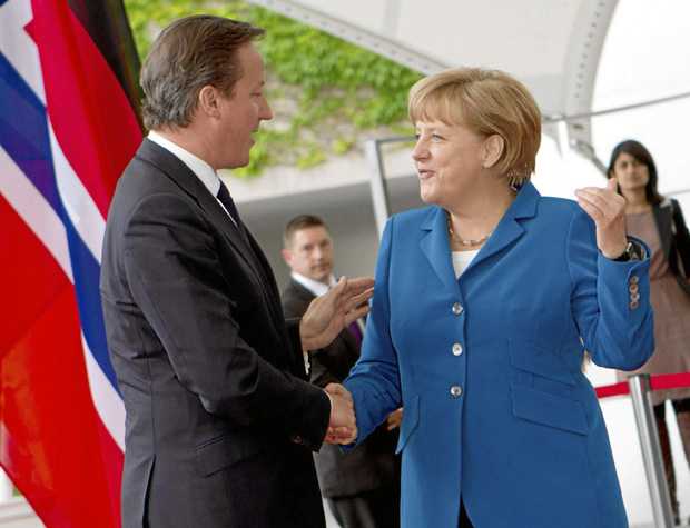 La canciller alemana, Angela Merkel (dcha), y el primer ministro británico, David Cameron. Merkel aseguraque el pacto fiscal es un paso necesario, pero no suficiente para salvar el euro, al tiempo que afirmó que se requiere "más coherencia" y más "cosas comunes" en otras áreas de la política europea.