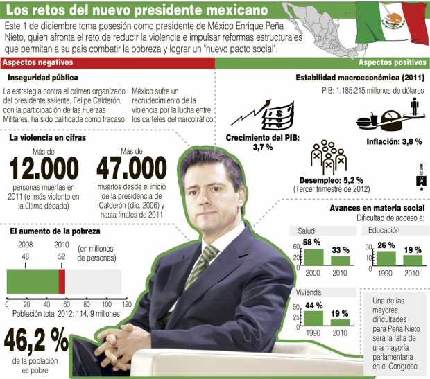 Peña Nieto deberá demostrar que no es un presidente "impuesto" y "prefabricado" por la cadena Televisa, como sostienen sus críticos, entre ellos el excandidato de la izquierda, Andrés Manuel López Obrador, que no ha reconocido su triunfo.