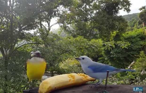 Pajaritos de todos los colores llegan y aceptan el desayuno que les ponen allí: un plátano maduro para todos.
