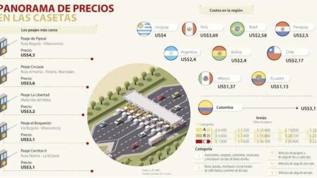 De acuerdo con los expertos consultados por LR, el alto precio de los peajes en Colombia es producto del retraso en la infraestructura nacional y la complicada geografía, que hacen que en las casetas del país se manejen precios que oscilan entre US$2,04 y US$7,37 para todo tipo de vehículos.