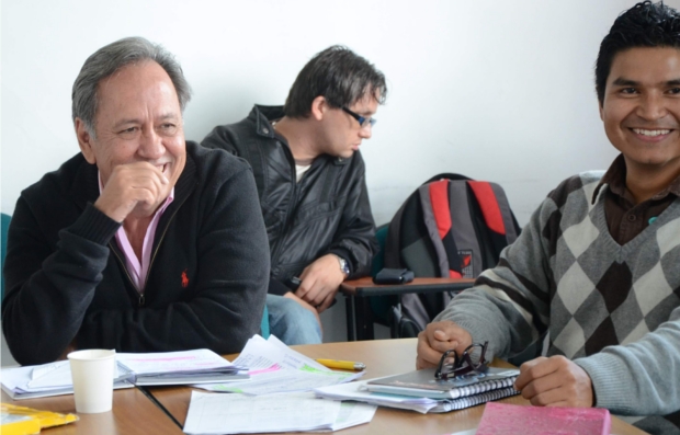 Al aula H 206 de la sede Palogrande de la Universidad de Caldas entra todos los viernes, a las 4:00 de la tarde, un hombre de 65 años. Se sienta mientras llegan sus compañeros de clase y saca unas copias subrayadas con verde y rosado fosforescente. Las lee por encima, pero durante la semana las ha rumiado con un diccionario al lado.