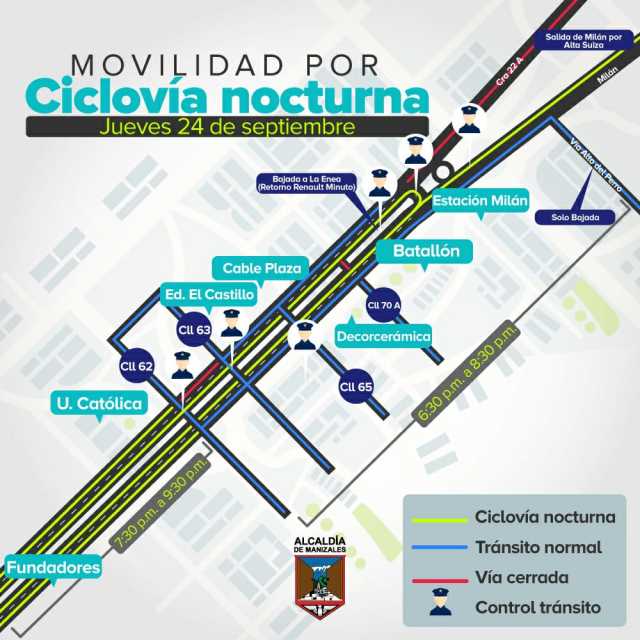 La ciclovía nocturna de esta noche, en la que estarán presentes los alcaldes del Área Metropolitana Centrosur de Caldas y Luis Carlos Velásquez, gobernador de Caldas, provocará cambios en la movilidad de esta noche en la Avenida Santander y Milán.