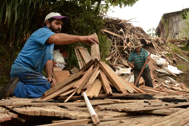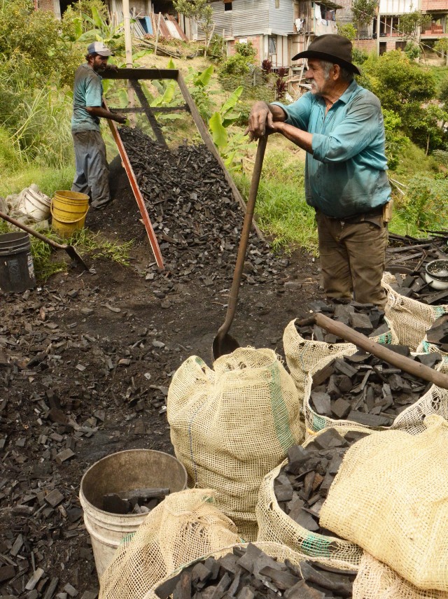 Oscar Giraldo y su hijo, Jhon Jairo, queman madera reciclada para hacer carbón, allí reciben la madera desechada de demoliciones de casas en Manizales. Cuando es madera sola cobran $10 mil por recibir un viaje en camioneta y cuando es revoltura como esterilla y guadua, $20 mil.