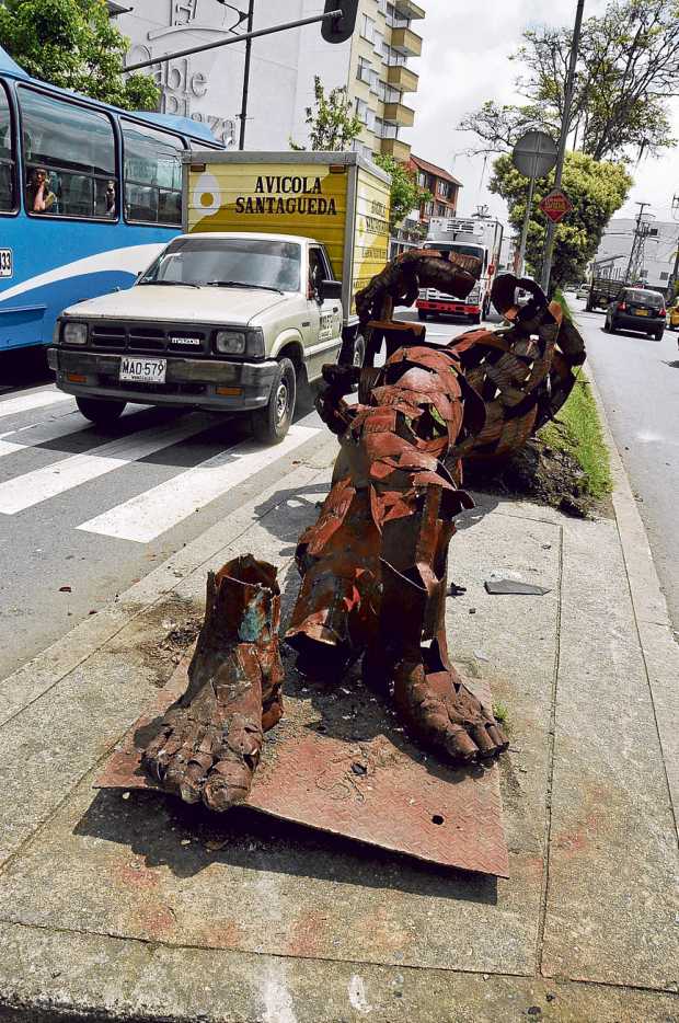 La escultura, llamada El dial, la donó en agosto del año pasado la Corporación Tecnológica del Pacífico Central, con otras dos, a propósito del Mundial Sub 20. No obstante, esa donación apenas está en trámites de legalización ante la Alcaldía de Manizales, por lo que la Corporación anunció que recogería la escultura dañada por el accidente. "A la 1:00 de la tarde lo haremos", dijo ayer Julio César Marulanda, presidente de la Corporación, quien agregó que la repararán para volverla a instalar.