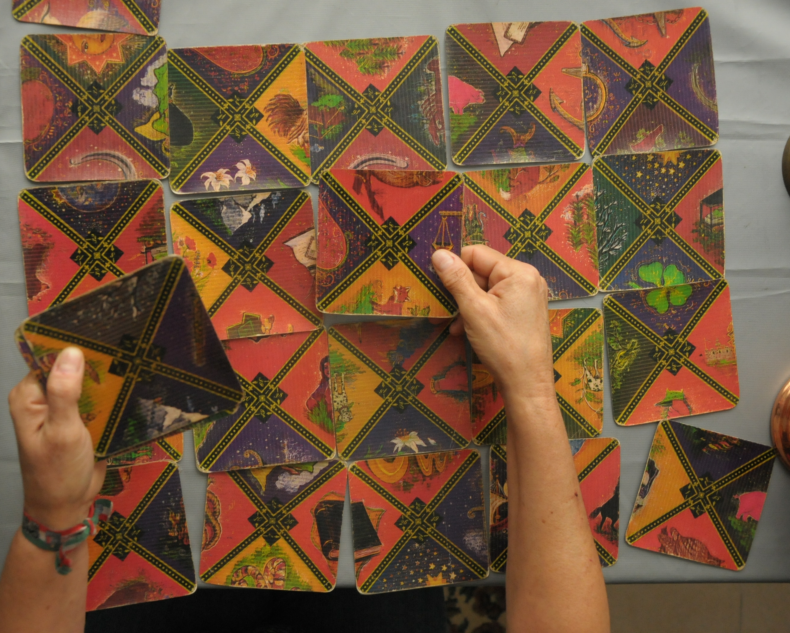 Montaña, búho, libro y anillo son las imágenes que resultan en la conjunción de cartas. Descubre una tras otra con los dedos, cuyas uñas fucsias están descascaradas y vislumbran el color marfil. Usa dos anillos, uno en cada mano. Oro y esmeralda este, oro y otra piedra aquel. Su pelo, rubio cobrizo, está resuelto en una cola que no baja más allá de los omoplatos. Debe rondar los 60.