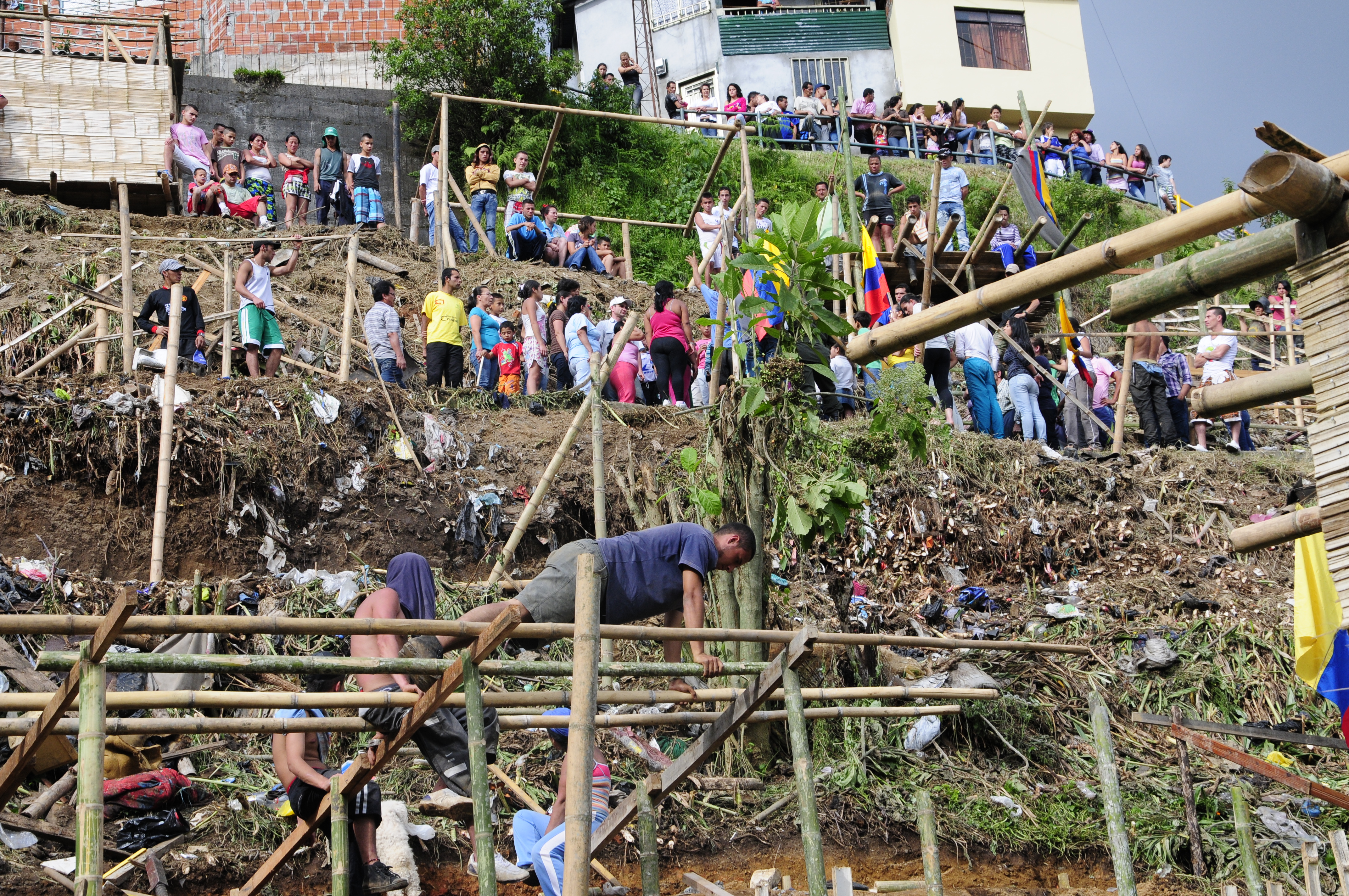 Con piedras, picas y palas, unas 70 personas se armaron ayer, cerca de la calle 36A con carrera 35, para impedir que la Policía destruyera las casas de bahareque que estaban levantando, desde el pasado jueves, en una ladera (ubicada entre el barrio Arrayanes y Bajo Cervantes).