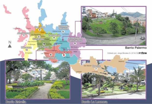 La comuna Palogrande de Manizales limita con las comunas Tesorito, Estación, Ciudadela del Norte, La Fuente, Cerro de Oro y Universitaria. Los 14 barrios que la componen son: Arboleda, Belén, Camelia, El Trébol, Guayacanes, La Estrella, La Leonora, La Rambla, Laureles, Los Rosales, Milán, Palermo, Palogrande y Sancancio.