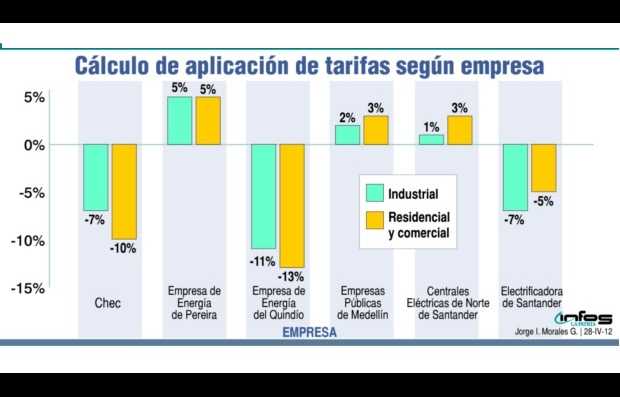 * Según la Chec, en el nivel tres, que es donde están los industriales grandes, se ha tenido el mejor cargo de distribución (precio) frente a Pereira y Antioquia. "El gran beneficiado con esta medida será el sector residencial", dijo Bruno Seidel Arango, gerente de la Chec.