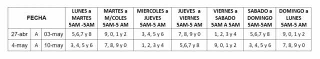 Los taxis prestarán su servicio desde las cero horas del 27 de abril hasta las cero horas del 11 de mayo. Solo podrán transitar los vehículos cuyo último dígito de la placa corresponda a los siguientes números.