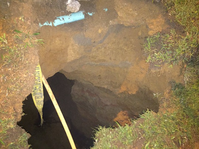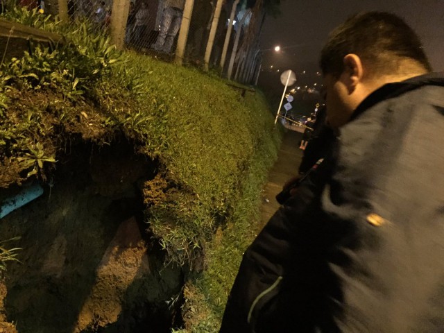 El problema se presentó al frente de la portería del conjunto Torres de Buenavista (al lado de Helados La Fuente). Según la información, un tubo de aguas de Manizales se rompió, lo que provocó un socavón que afectó un sector de la vía.