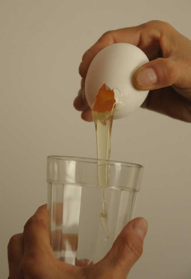 Dentro del vaso, que eleva hasta la altura de la frente y sobre el cual no deja de vaciar el huevo, se definen tres capas, aceitosas. La superficie es transparente, en la mitad es blancuzco y toma formas que se revuelven como humo de cigarro, leeeeeeeeeeeeeeeeeeeentamente. El fondo es casi traslúcido, con partículas color de ámbar.
