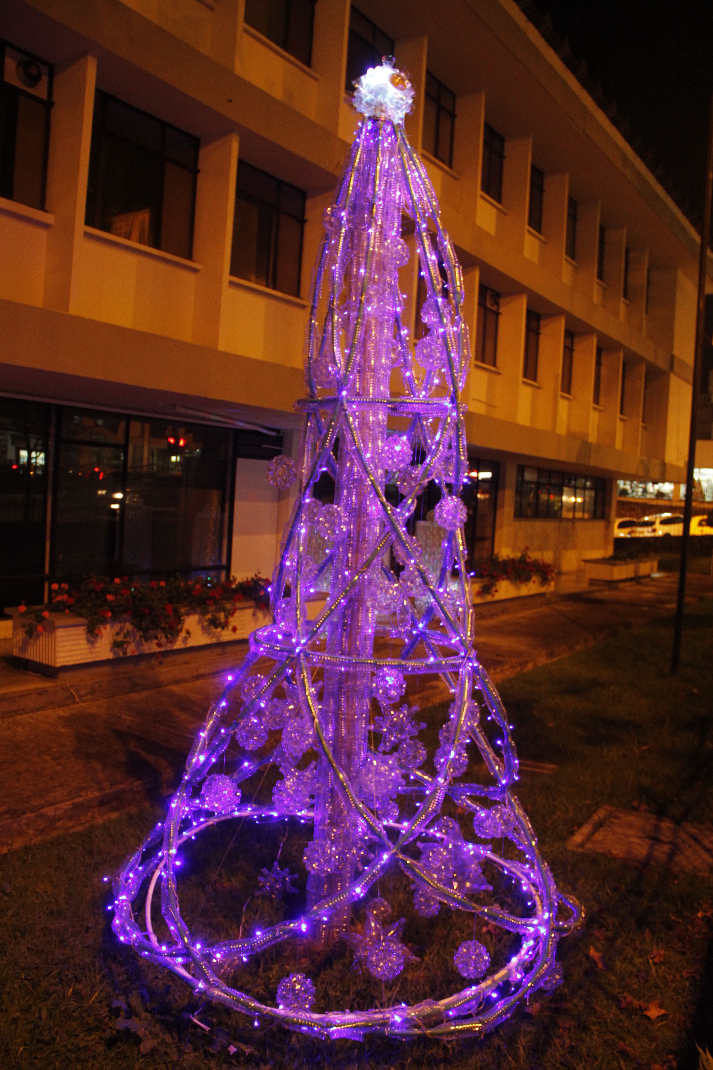La estructura y los adornos están hechos con los picos y las bases de las botellas.Para hacer cada bola decorativa se necesitaron 12 de ellas.