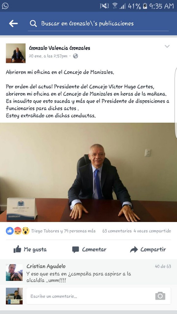 El pasado viernes, a las 2:57 de la tarde, el expresidente del Concejo de Manizales Luis Gonzalo Valencia escribió en su cuenta de facebook: "Abrieron mi oficina en el Concejo. Por orden del actual presidente Víctor Hugo Cortés, abrieron mi oficina en horas de la mañana. Es inaudito que esto suceda, y más que el presidente dé disposiciones a funcionarios para dichos actos. Estoy extrañado con dichas conductas".