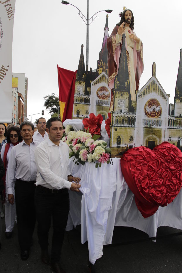 Jaime Montoya, decorador de la carroza del Sagrado Corazón de Jesús estaba trasnochado, pero muy contento. Se acostó a la 1:00 a.m. cuando pegó la última flor de la carroza. Tardó ocho días en terminarla. Su tarea era que la imagen estuviera perfecta para la procesión. Lleva 20 años como decorador y ha hecho diseños para desfiles en Manizales como el de La Macarena. Esta vez se inspiró en el renacimiento del Sagrado Corazón, saliendo de la Catedral de Manizales, ícono de la ciudad. En su recorrido ayer por la carrera 23 la gente se inclinaba ante la imagen. Jaime expresó que sentía que con su trabajo ayudaba a avivar la fe de los creyentes. La procesión culminó al mediodía en la Plaza de Bolívar. Luego hubo misa en la Catedral.