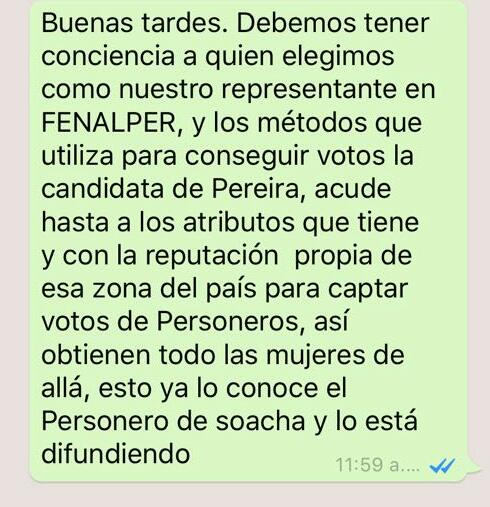 "Buenas tardes. Debemos tener conciencia a quien elegimos como nuestro representante en Fenalper, y los métodos que utiliza para conseguir votos la candidata de Pereira. Acude hasta a los atributos que tiene y con la reputación propia de esa zona del país para captar votos de personeros, así obtienen todo las mujeres de allá, esto ya lo conoce el personero de Soacha y lo está difundiendo".
