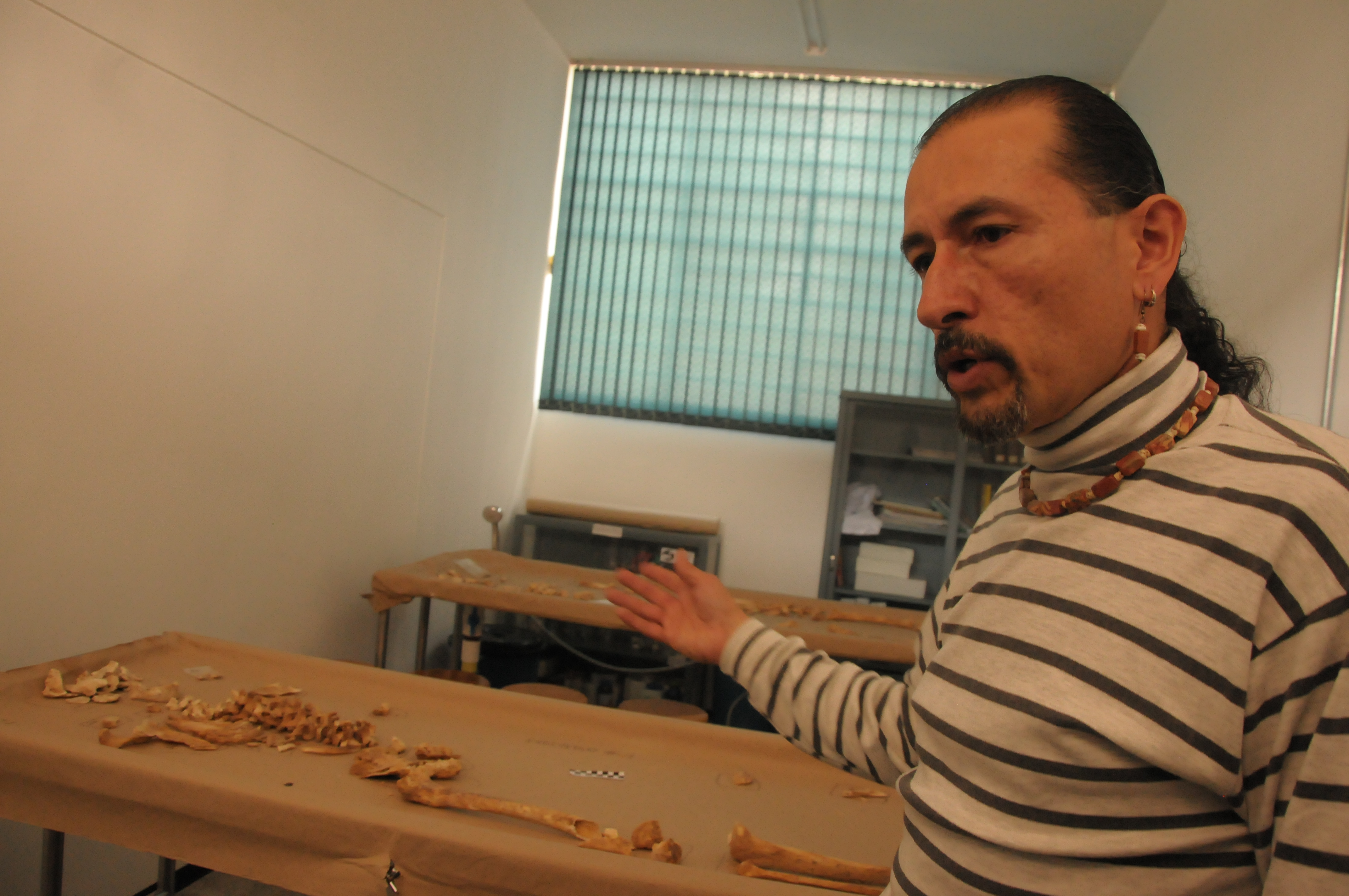 "La tumba estaba en un talud de la carretera y tenía dos cuerpos. El arqueólogo decidió traerlos para este laboratorio. Él no es docente, pero sabe que acá le podemos brindar los equipos y la ayuda que requiera para su estudio. Estaban muy sucios y se ha ido mucho tiempo limpiándolos", comentó Mario Alonso Bermúdez Restrepo, docente investigador, coordinador del Laboratorios de la Facultad de Ciencias Jurídicas y Sociales.