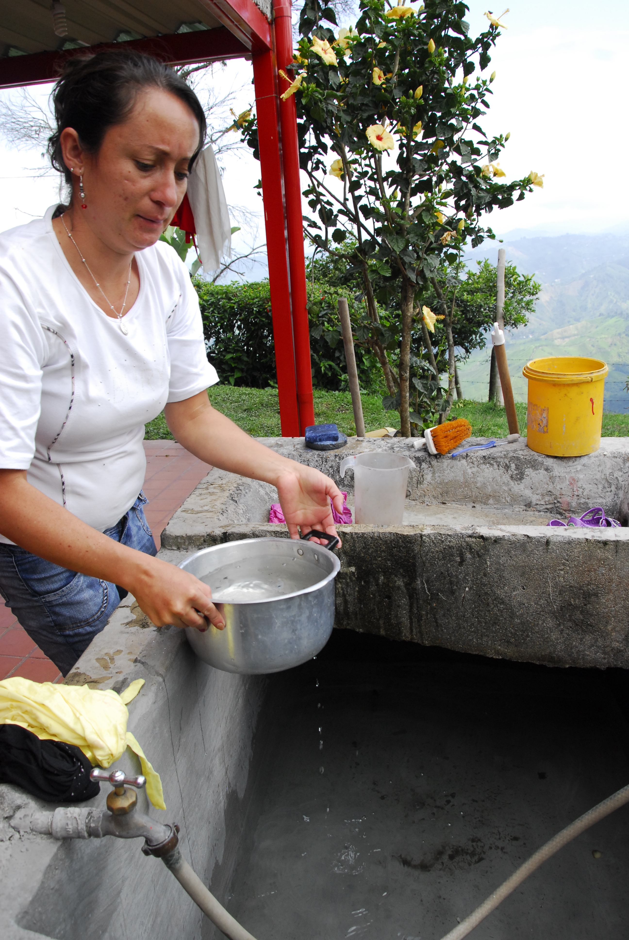 "Es normal que baje la presión", indica Maryluz Salazar, que vive justo al lado del tanque. Ella explica que aunque están al lado de la fuente de agua de toda la vereda, las siete casas que se ven afectadas se surten de la tubería que entra al tanque por la parte de atrás y no directamente de la reserva.