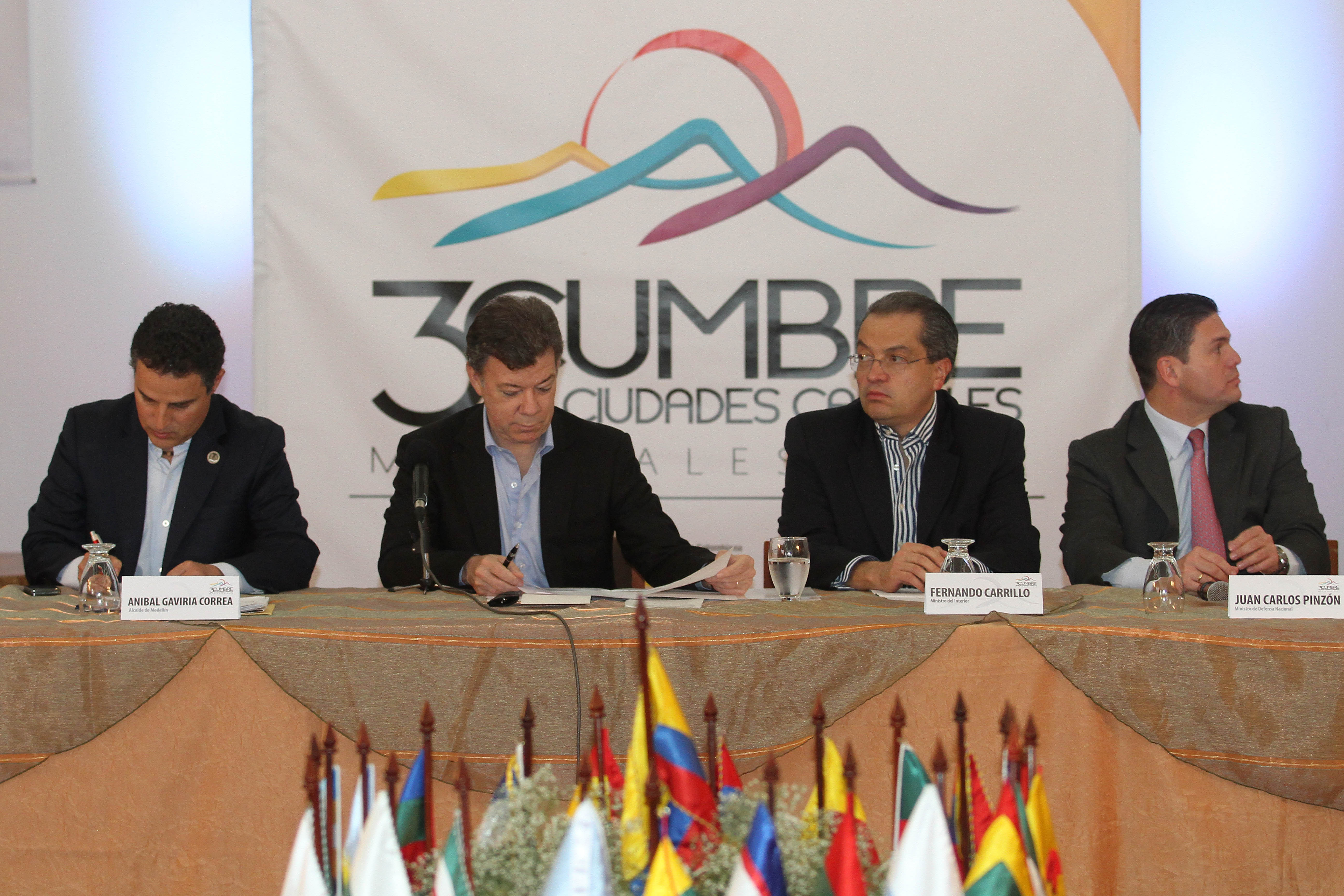 En compañía del Ministro del Interior, Fernando Carrillo y del Ministro de Defensa, Juan Carlos Pinzón, el Presidente Juan Manuel Santos, llegó a la “Tercera Cumbre de Alcaldes de Ciudades Capitales”, para cerrar dicho evento.