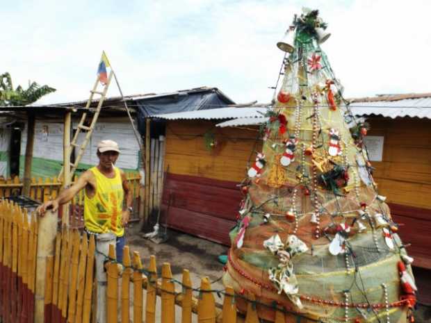 Las calles polvorientas de esta vereda las adornaron con objetos de reciclaje, como CD, botellas plásticas, cajas de cartón y costales. Mientras los niños pasan el tiempo jugando con carros y muñecos, los adultos hacen los preparativos para recibir a Jesús.