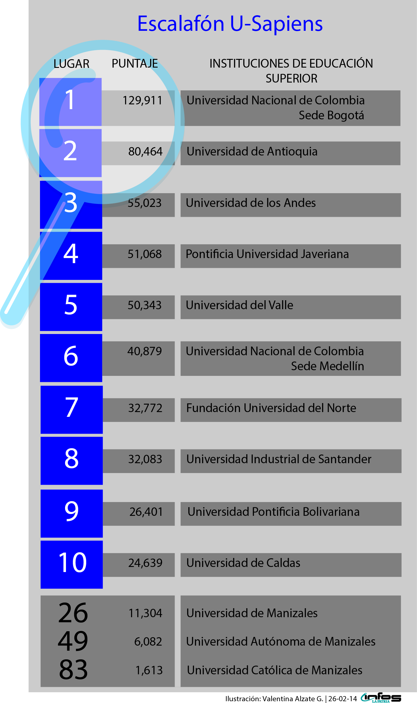 Explicó que la clasificación la realizan desde el primer semestre del 2010, período en el que la U. de Caldas arrancó en el puesto 10, en el que se mantiene en este séptimo informe.