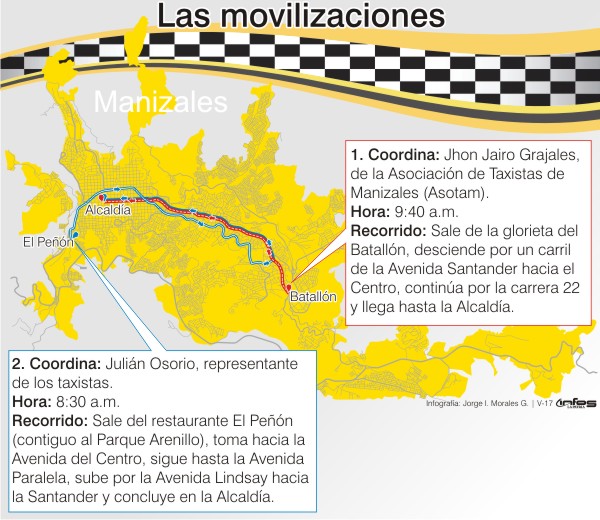 Grajales agrega que en Manizales sí han sentido apoyo de la Alcaldía para controlar la ilegalidad, como el mototaxismo y los taxis que hacen carreras como colectivo. Pese a lo que dice Grajales, Julián Osorio, representante de otro grupo de taxistas y quienes también se movilizarán hoy, se queja de lo contrario. Dice que a la Secretaría de Tránsito le falta intensificar los controles y que hay persecución. "No es solamente que mande a la Policía a hacer comparendos en contra del gremio".