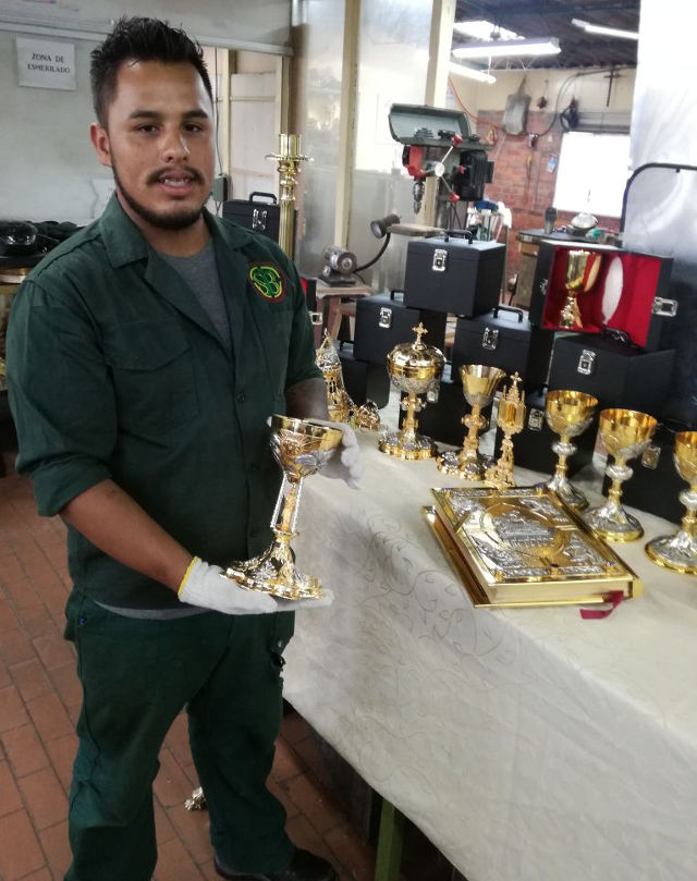 Este cincelador trabaja en el taller Santa Bárbara, del barrio Ciudad Jardín Sur de Bogotá, donde un grupo de 13 personas se encargó de fabricar copones, cáliz, lavado, relicarios, incensario, evangelario, patenas y candelabros, por solicitud del Comité litúrgico de la capital del Meta.