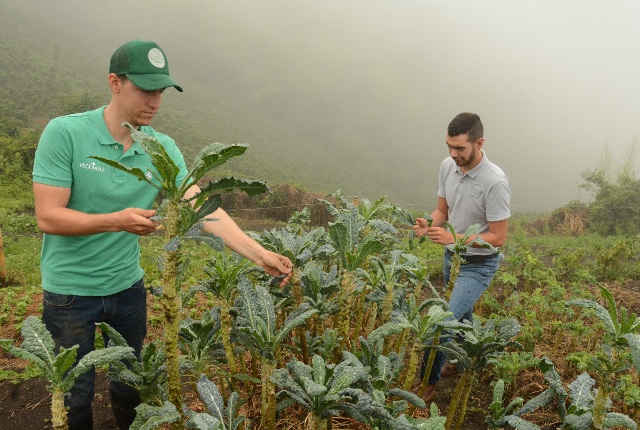 El ingeniero agrónomo de la U. de Caldas Juan Martín Zuluaga, de 27 años, y el diseñador industrial de la U. de Autónoma Sergio Cardona, de 26, de lunes a viernes trabajan en los cultivos de vegetales baby y hojas gourmet que siembran en una finca de la vereda Bajo Tablazo.