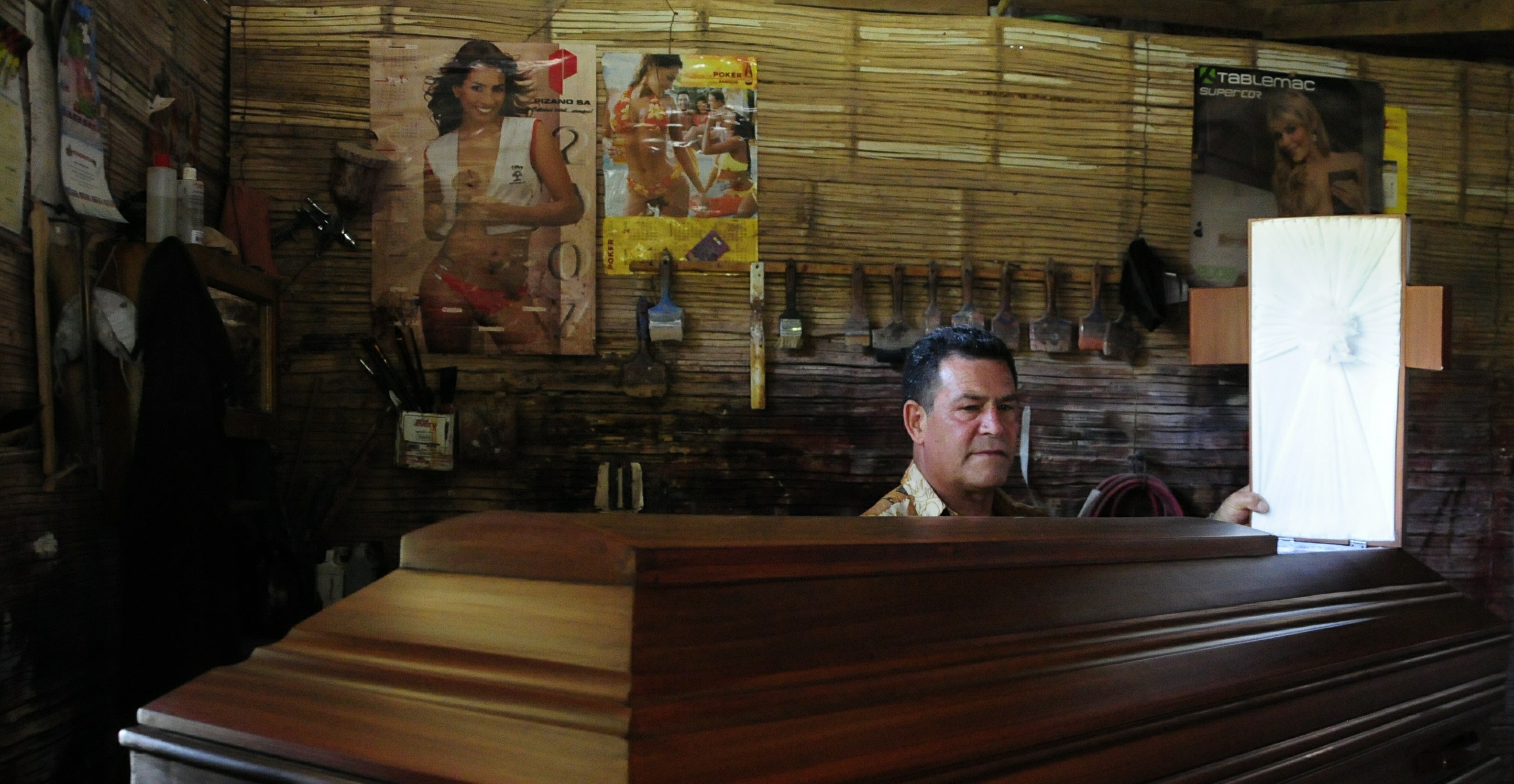 A las 6:00 de la tarde coloca los ataúdes armados sobre los que están listos. Apaga la luz y cierra el negocio.