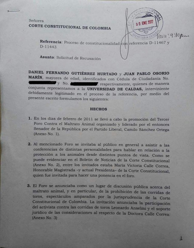 Los abogados manizaleños Daniel Fernando Gutiérrez y Juan Pablo Osorio radicaron esta mañana una solicitud de recusación en contra de la magistrada de la Corte Constitucional y actual presidenta del Alto Tribunal, María Victoria Calle.