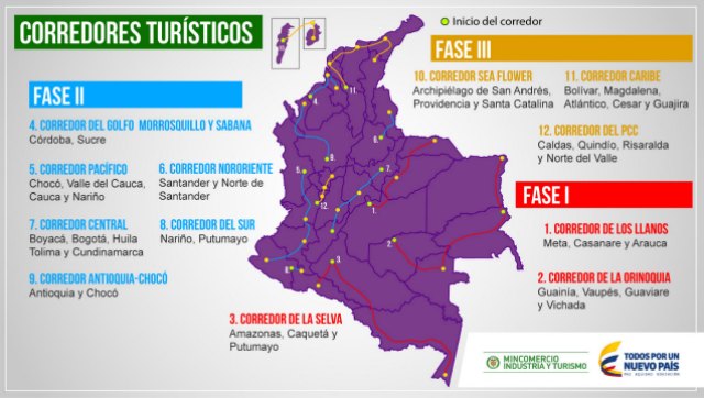 María Claudia Lacouture, ministra de esa cartera, explicó que en los doce corredores están integrados los segmentos que ha priorizado el Ministerio, en conjunto con autoridades locales, que son el turismo de naturaleza, cultura, gastronomía, avistamiento de aves, salud, bienestar y reuniones.