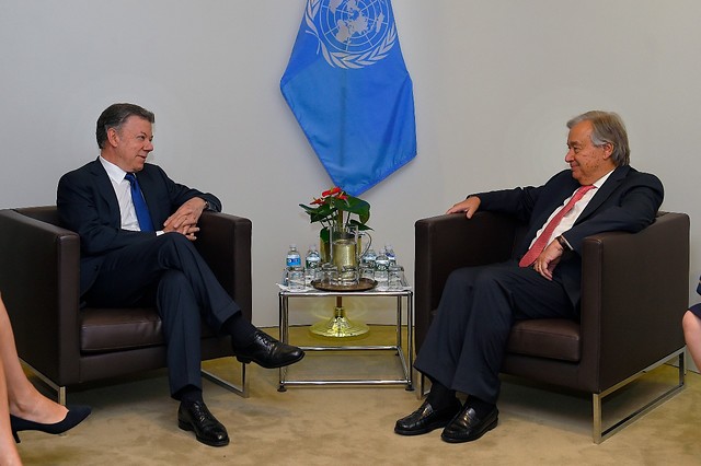 Sobre los encuentros no se conocieron mayores detalles, solo una referencia que hizo el presidente: "Colombia, lo ha dicho el Secretario General -con quien me reuní esta mañana-, es la única buena noticia que Naciones Unidas tiene este año. Es el único lugar en el mundo en el que en vez de acumular armas las estamos destruyendo. En un mundo marcado de violencia y de tensiones políticas, traemos un caso exitoso, un caso de paz que estamos comenzando a construir".
