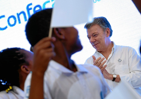 "La paz se va a firmar aquí en Cartagena", dijo el mandatario al intervenir en la clausura del 53 Congreso Anual de la Confederación Colombiana de Cámaras de Comercio (Confecámaras) en esa ciudad del Caribe.