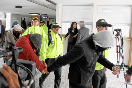 Ante la jueza 72 de garantías, que lleva a cabo la medida de aseguramiento en contra de los 13 detenidos por atentados y disturbios en la Universidad Nacional, la Fiscalía presentó el correo que amenaza de muerte al fiscal Eduardo Montealegre, donde intimidan con 'poner' una bomba en los juzgados de Paloquemao si los jóvenes eran declarados culpables.
