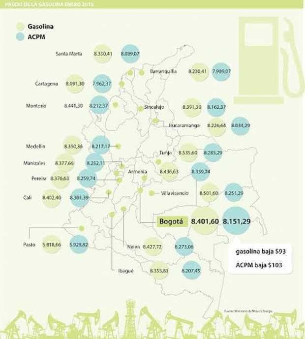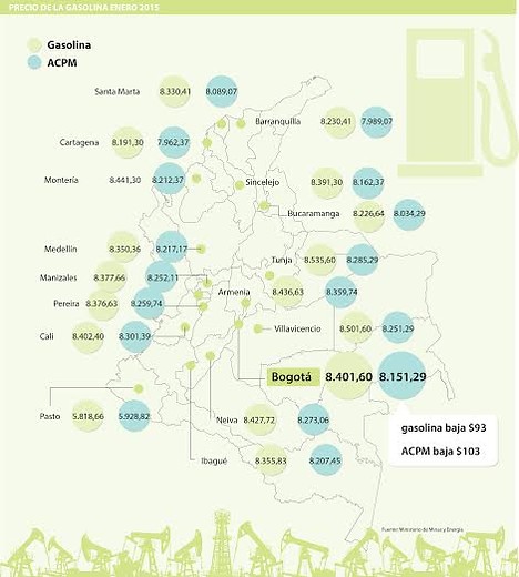 El Ministerio de Minas y Energía explicó que "acorde con la fórmula que utiliza el Gobierno Nacional desde 2011, los precios de los combustibles disminuyen para el próximo mes debido a la caída de los precios internacionales del crudo; sin embargo cabe mencionar que el aumento en los precios de los biocombustible y la devaluación que sufre la moneda local impidieron que la reducción final de la gasolina y del ACPM fuera mayor para enero"