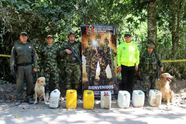 El comandante de la Metropolitana, coronel Carlos Hernán Camacho Sarmiento, se refirió al operativo efectuado por soldados del batallón Jaime Rooke y la Policía, quienes arribaron a la vereda La Loma, encontrando siete canecas, cada una con 35 kilos de R1.