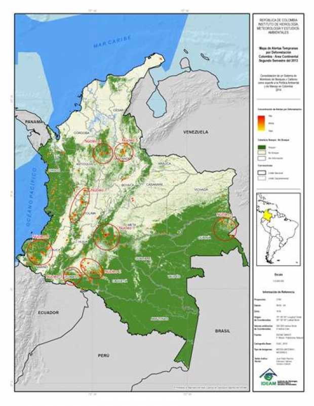 En el primer ‘Boletín de Alertas Tempranas de Deforestación en Colombia’, publicado el primer semestre de 2013, ya se habían identificado los primeros tres focos de deforestación: municipios del Pacífico norte (Acandí y Quibdó, en Chocó); Pacífico centro (litoral de San Juan (Chocó), y departamento del Caquetá (Cartagena del Chairá y San Vicente del Caguán).