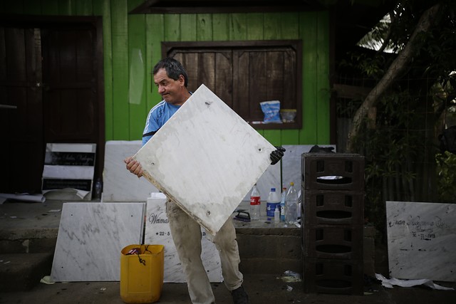 Las lijas, el mármol, la tintura, las fotos de los difuntos y el tallado de los nombres en las lápidas, que normalmente suele trabajar en un taller ubicado frente al cementerio Central, ubicado en el centro de Bogotá, se trasladaron a más de 400 kilómetros de la capital, al corregimiento Bellavista en Bojayá.