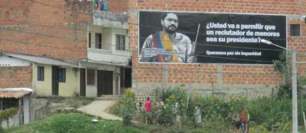 El fenómeno de las vallas alusivas al proceso de paz no se detiene. Esta vez, en el municipio de Caldas, Antioquia, apareció una nueva pieza publicitaria con la imagen de alias "Iván Márquez" y la pregunta: "¿Usted va a permitir que un reclutador de menores sea su presidente?".