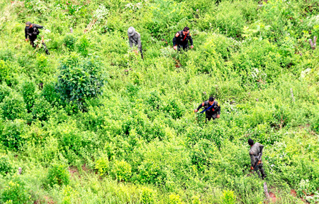 La Policía, respaldada por las fuerzas armadas, erradica unas cien hectáreas de coca por día en esta zona del país.