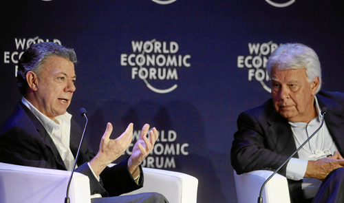 El presidente, Juan Manuel Santos, participó ayer con el expresidente de España Felipe González (1982-1996), en el conversatorio Asegurar la paz de Colombia en el Foro Económico Mundial que se realiza en Medellín.