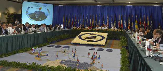 El jefe de Estado, quien llegó en la mañana a Haití, a la que aún se le nota los vestigios de la afectación por el terremoto de enero de 2010, durante su intervención reportó a los mandatarios los objetivos del proceso de negociación con ese grupo insurgente.